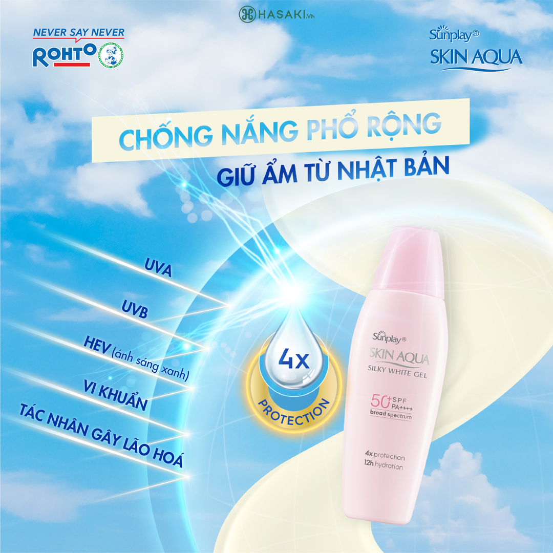 Sunplay Kem Chống Nắng Dưỡng Da Sáng Mịn Skin Aqua Silky White SPF50 PA++++ với khả năng bảo vệ da và giữ ẩm cho làn da khi tham gia các hoạt động ngoài trời trong nhiều giờ liền dưới ánh nắng mùa hè.Công nghệ chống nắng Watery Capsule giúp bảo vệ da tối ưu. Chỉ số chống nắng SPF 50 và PA++++ giúp chống nắng mạnh mẽ trong nhiều giờ. Giúp dưỡng làn da trắng sáng mịn màng tự nhiên.